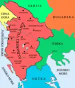 The Partition of Albania (Albanian: Copëtimi i Shqipërisë) is a term used for the partition of the Albanian state, which proclaimed its independence on 28 November 1912. The delineation of the newly established Principality of Albania under the terms of the London Conference of 1912-1913 (29 July 1913) and the Ambassadors of the six Great Powers of that time (Great Britain, France, Germany, Austria-Hungary, Russia and Italy) left Albanian and non-Albanian populations on both sides of the border. Representatives of the Albanian national movement viewed this as a partition of claimed Albanian-inhabited territories, also territories contained in a proposed Albanian Vilayet.[1][2][3]