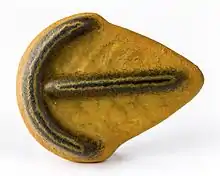 It has a raised ridge down the central axis of symmetry. This ridge can be high in unflattened fossils. At the 'head' end of the ridge there are two quarter-circle-shaped raised arcs attached. In front of this are two nested semicircular lines. Teeth seem to come from the raised parts pointing into the centre spaces. These may show as raised lines.