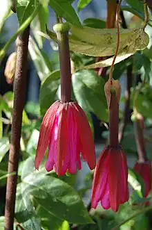 It is a robust evergreen climber growing to at least 6 m (20 ft) with three-lobed leaves and pendent deep pink tubular flowers followed by egg-shaped yellow fruits. It is hardy down to about −1 °C (30 °F) so may be grown outdoors with shelter in mild temperate areas; alternatively under glass, for instance in an unheated greenhouse.