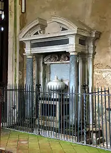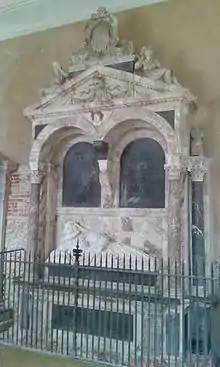 The Paston family monuments are situated at the eastern end of the building. That of Katherine Knevet/Knyvett (d.1628) (the wife of Sir Edmund Paston (d.1632)) stands on the north side of the chancel. This was created by Nicholas Stone, master-mason to King Charles I, who was frequently employed by the Paston family.[19] It includes a verse epitaph written by the famous metaphysical poet John Donne, Dean of St Paul's Cathedral in the City of London.[20] The monument is made of alabaster and pink-veined marble and features a semi-recumbent effigy of Lady Paston sculpted in white marble and surrounded by numerous allegorical figures. Stone also designed the adjoining monument to her husband Sir Edmund Paston (d.1632), comprising a plain urn on a bare base in an aedicule of black Doric columns. Pevsner commented: "the contrast between the severity of the one and the ebullience of the other is startling".[21] The chancel also contains three chest tombs, the one at the eastern end probably of John Paston (d.1466) who was originally buried in Bromholm Priory following a magnificent funeral at which were consumed forty barrels of ale.[18]