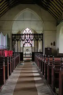 The parish church of Saint Margaret dates from the 14th century and is constructed from flint.[13] English Heritage has given it Grade I listed building status.[14] It has an embattled tower which looks down on a thatched roof. The porch is on the south side and opens into a plain nave and chancel which is divided by a 15th-century rood screen.[15] The church has been restored three times, in 1601, 1843 and 1869.[16] In 1922 medieval wall paintings were uncovered, one depicting Saint Christopher carrying the Christ child, another depicting the legend of the three kings who, when hunting merrily in the forest, suddenly encountered three hanging skeletons.[17] There is also a small figure from a 'weighing of souls' and the remains of some post-Reformation texts.[18]
