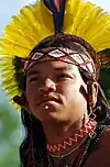 The Pataxó are an indigenous people in Bahia, Brazil with a population of about 11,800 individuals. They once spoke the Pataxó language, but now speak Portuguese and a revitalized version of the Pataxó language called Patxohã.[2] The Pataxó's territory is part of a wider region traditionally inhabited by the group. The region was mainly converted into private farms by settlers who persecuted the Pataxó, and in 1961, they were expelled from the largest remaining forest and integrated into the dominant society, losing their indigenous identity and settling in cities. Others moved to coastal areas, forming new indigenous villages, including Coroa Vermelha, founded in 1972 and now home to approximately 6,000 people. In 1998, a group of Pataxó women created the Jaqueira Reserve, which comprises 827 hectares in the Environmental Protection Area of the Coroa Vermelha Indigenous Territory in South Bahia, where they operate a community-based cultural identity and ecotourism project, the Associação Pataxó de Ecoturismo, which employs indigenous families.[3]