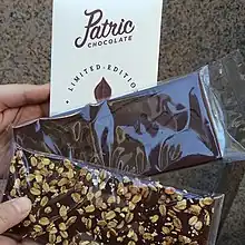Patric Chocolate bars are handcrafted from cocoa beans sourced directly from farms or cooperatives. Over the years, the company's line has included more than thirty different bean-to-bar chocolate bars, a variety of house-made confections, chocolate beverages, chocolate bakery items, and many other chocolate products. Patric Chocolate has always crafted its premium chocolate from bean-to-bar while incorporating many practices over time that emphasize sustainability, such as sourcing mostly certified organic ingredients, purchasing cacao for higher than conventional prices, and placing an emphasis on recycling and renewable energy use.[6]