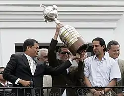 ![]() Patricio Urrutia (C) celebrates with President of Ecuador Rafael Correa (L) and LDU goalkeeper Jose Cevallos (R) the 2008's Copa Libertadores of America | |||