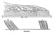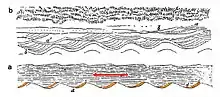 In the early 1830s, Ganly had sketched how the ripples of sediment left by a Donegal river north of Carndonagh had resulted in an undulating cross-sectional pattern. In 1838, at Coosnagloor on the Dingle Peninsula, he made further sketches, noticing cross-bedding in sedimentary rocks along the shore, and as he moved southwards the rocks appeared to be getting younger. At the very southern end, however, the bedding appeared inverted (see illustrations). He correctly interpreted this as synclinal folding. He had discovered a way of showing which way up the stratification had originally occurred.[2][3]