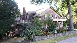 The house itself is a weatherboarded structure two stories tall.[2] Different sections of the house have different roof styles: the east-facing front rises to a gable, five bays wide on the first story and three on the second, while a projection on the southern side is covered with a hip roof. Porches shelter parts of the front and southern sides, and numerous shuttered windows, many six-over-six, are placed throughout the facade.[3] The main entrance pierces the gabled front section; situated in the central bay of the first story, it is surrounded by sidelights and a transom light. Components of the facade demonstrate both the Greek Revival origins of the design and its vernacular interpretation: fluted columns in the Doric order support the porch roof,[2] but the bottom section of the gable's pediment is interrupted by all three second-story windows.[3]