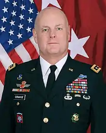 Donahue was previously the Commanding General, United States Army Africa, Vicenza, Italy.[2] He also served as the Deputy Chief of Staff, U.S. Army Training and Doctrine Command, Joint Base Langley-Eustis, Virginia, Deputy Commanding General (Maneuver), 3rd Infantry Division, Fort Stewart, Georgia and U.S. Division North-Iraq from 2008-2010; Commander, 1st Brigade, 82nd Airborne Division from 2003-2006 and commanded the brigade combat team on two deployments to Afghanistan and one to Iraq; Commander, Operations Group Bravo, U.S. Army Battle Command Training Program/Chief of Future Operations, V Corps from 2002-2003 for the initial Iraq invasion; and Assistant Chief of Staff, G3 and Commander, 1st Battalion 506th Infantry Regiment (Air Assault), 2nd Infantry Division, Republic of Korea from 1998–2001.