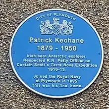 Patrick Keohane was born in Courtmacsherry, County Cork, Ireland, in 1879. He joined the Royal Navy and rose to the rank of petty officer. Served with Teddy Evans on HMS Talbot.[1]