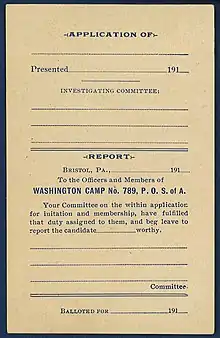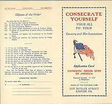 - ↑ State Camp of Pennsylvania and Subordinate Camp Constitution Preceded by the National Camp Constitution and General Laws of the Patriotic Order of Sons of America (Philadelphia: P.O.S.A, 1945, pp. 5-7.