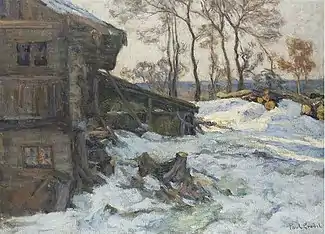 He observed the practice of painting en plein aire and became involved in the private academy, in the suburbs north of Munich, that was operated by Bernhard Buttersack. His fellow students there included Christian Landenberger, Otto Ubbelohde and Wilhelm Ludwig Lehmann.[1] Later, possibly at the suggestion of Lehmann, who was Swiss, he explored the Alps in the vicinity of Isny and spent the winter of 1907–08 in Switzerland.