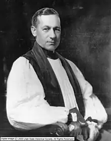 Jones accepted a position at the mission church of St. John in Logan, Utah[8] and also ministered to students at the nearby Utah Agricultural College. He also cleared a farm in the mountains (that was later donated to St. John's Church),[9] as well as traveled to remote parishes in the large missionary district.[10] Bishop Ethelbert Talbot of the Episcopal Diocese of Central Pennsylvania had ordained him a deacon after his graduation, and by year's end, Bishop Spalding had ordained him a priest. His rank increased from associate of the St. John's mission to priest-in-charge in 1911. Jones also served as secretary of the diocesan convocations from 1907 until 1914.[11] Like Bishop Spalding, Jones was a social activist and pacifist, especially after witnessing ill-treatment of miners and railroad workers, as well as discrimination against German immigrants in Salt Lake City.[12]