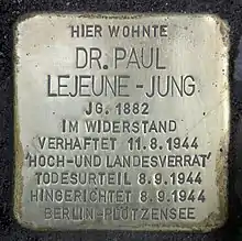 Paul Adolf Franz Lejeune-Jung, (actually Lejeune genannt Jung, meaning called Jung) (16 March 1882 in Cologne – 8 September 1944 in Berlin, executed) was a German economist, politician, lawyer in the wood pulp industry, and resistance fighter against Adolf Hitler's Third Reich.