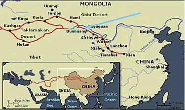 Pelliot stayed in Hanoi until 1904, when he returned to France in preparation for representing the EFEO at the 1905 International Conference of Orientalists in Algiers.[3] While in France, Pelliot was chosen to direct a government-sponsored archaeological mission to Chinese Turkestan (modern Xinjiang).[3] The group departed in June 1906 and spent several years in the field (see below).[3] By the time the expedition reached Dunhuang, Pelliot had learned Mongolian, Arabic, Persian, the Turkic languages, Tibetan, and Sanskrit, among others, which proved invaluable while examining the many non-Chinese items among the Dunhuang manuscripts inside the Mogao caves.[4]