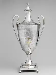 Revere's original silverware, engravings, and other works are highly regarded today, and can be found on display in museums including the Museum of Fine Arts, Boston[96] and the Metropolitan Museum of Art.[97] The Revere Bell, presented in 1843 to the Church of St. Andrew in Singapore by his daughter, Mrs. Maria Revere Balestier, wife of American consul Joseph Balestier, is now displayed in the National Museum of Singapore. This is the only bell cast by the Revere foundry that is outside the United States. For a time, it was displayed behind velvet ropes in the foyer of the United States Embassy in Singapore.[98]