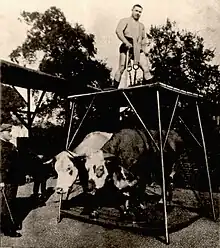 His most well-known feat was when he stood on a scaffold and lifted up a platform holding two full-grown oxen (total weight: 2,064 kg or 4,550 lb) almost half a meter high on an iron chain.[2]