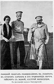 Finally, in 1907 in Irkutsk he married Vera Nikolayevna Krassan (Leonutova),[lower-alpha 4] with whom he had a daughter, Tatyana (1907–1994), and adopted Vera's daughter Olga (1901–1918) from her first marriage. Unlike his other marriages, Rennenkampf's marriage with Vera was long and happy. Vera, as the wife of the commander of the Vilna Military District, was a trustee and member of a branch of the International Red Cross and Red Crescent Movement. When the war broke out, she participated in organizations that cared for the wounded. In Vera's memoirs, she wrote of her founding of the Committee for Assistance to the families of reserve lower ranks, tailoring workshops for the front, and her participation in the formation of the flying car detachment of the Evangelical Red Cross that took the wounded from the battlefield.