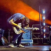 In September 2010, Pavement appeared on The Colbert Report and Late Night with Jimmy Fallon.[57] After concluding their proper US tour at the Hollywood Bowl on September 30, the band played the following night in Las Vegas at the Palms Casino as a part of the Matador At 21 festival.[58] During their set, Scott Kannberg kicked his monitor and smashed his guitar into his amp in frustration of not being able to hear himself while performing.[58] NME noted the band had an "icy atmosphere onstage".[58] The band honored a further two South American show commitments in November 2010.