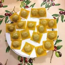 The filling of the Pavese agnolotti is based on Pavese stew.[1] The recipe for this stuffed egg-based pasta is characterized by influences from Piedmontese and Piacentino cuisine, characteristics of areas that border the Oltrepò Pavese.[5] The shape of the pasta was based on the Piedmontese agnolotti, and the filling of Pavese stew is based on stracotto alla piacentina, which is the filling for Piacentino anolini.[6] The Piedmontese agnolotti, in particular, differ from the Pavese agnolotti due to the filling, which is instead based on roast meat.[7] Pavese agnolotti is a typical dish of the Christmas tradition,[8] and are consumed during celebrations and important occasions.[9]