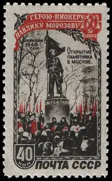 Pavel Trofimovich Morozov (Russian: Па́вел Трофи́мович Моро́зов; 14 November 1918 – 3 September 1932), better known by the diminutive Pavlik, was a Soviet youth praised by the Soviet press as a martyr. Evidence has emerged since the dissolution of the Soviet Union of the fabrication of the Pavlik Morozov legend, as well as what Soviet officials thought of him. His story, dated to 1932, is that of a 13-year-old boy who denounced his father to the authorities and was in turn killed by his family. His story was a subject of reading, songs, plays, a symphonic poem, a full-length opera, and six biographies. His politicized and mythologized story was used to encourage Soviet Bloc children to also inform on their parents.[1]