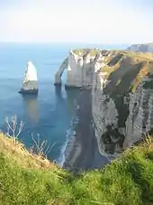 The Pays de Caux is a plateau of Upper Cretaceous chalk, like that which forms the North and South Downs in southern England. Its surface is an undulating plateau but the seaward side has been eroded by the waves so that the coast is formed of high white cliffs. The small valleys that inland form the undulations, are truncated here, leaving what are known locally as valleuses, steep-sided notches in the face of the cliff. They are more or less deeply cut, and some form the sites of small towns such as Étretat. The formations left in the eroded cliff there have long attracted artists. See the photograph where Étretat lies to the right, in the valleuse beyond the first ridge.