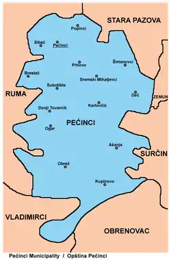 Pećinci (Serbian Cyrillic: Пећинци, Glagolitic script: Ⱂⰵⱋⰻⱀⱌⰻ, pronounced [pětɕiːntsi]; Hungarian: Pecsince) is a village and municipality located in the Srem District of the autonomous province of Vojvodina, Serbia. The village has a population of 2,581 (2011), while Pećinci municipality has 19,720 inhabitants.