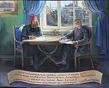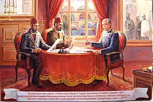 The 1879 Peace of Constantinople (Turkish: İstanbul Antlaşması or İstanbul Barışı, Russian: Константинопольский мир) reached between the Russian and Ottoman empires was a treaty signed on February 8, 1879 in Constantinople (modern-day Istanbul, Turkey). Aleksey Lobanov-Rostovsky, Russian ambassador to Sultan Abdul Hamid II, and the Ottoman Minister of Foreign Affairs, Alexander Karatheodori Pasha, and Ali Pasha, the Minister presiding over the Council of State of the Ottoman Empire, were those present to sign the agreement. It is a direct continuation of the Treaty of San Stefano.