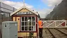 - Darley Dale Crossing: controls the section from Darley Dale to Matlock Riverside under the one train staff key, as well as the other gated level crossing at Station Road. Based on an L.M.S. ground level design, it was erected in 2007 to replace the older Midland style replica cabin which had become life-expired.