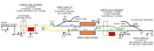- Darley Dale station: the passing loop at Darley Dale is worked using the Absolute Block method, with the signal box at the other end releasing the signal of the adjacent signal box to allow trains to enter the applicable up or down loop line. Due to the small length of the loop all signals are Home Starter combined signals, rather than the traditional separate distant, home and starter arrangements.