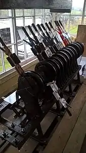 - Rowsley South: The Cabin was originally located at Bamford before it was moved to the up platform at Darley Dale initially, though it was never commissioned. Eventually it was moved to Rowsley in January 2014, whereafter restoration began. It will be used to control the loco shed sidings and yard exits as a shunt frame using a unique now in the UK, though still widely used in Europe, double wire driven point operation using the ex Barrow Hill sidings turnover style lever frame kindly donated by the National Railway Museum and point operating gear which has now been installed at Rowsley.