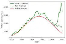 Predictions of future oil production made in 2007 and 2009 stated either that the peak had already occurred,[19][20][21][22] that oil production was on the cusp of the peak, or that it would occur soon.[23][24] A decade later world oil production rose to hit a new high in 2018, as developments in extraction technology enabled an expansion of U.S. tight oil production.[25][17][26]