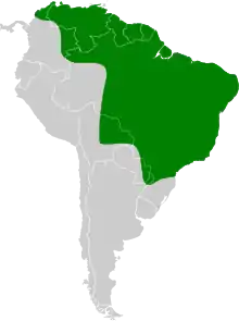 The pearly-breasted cuckoo nests in Argentina, Brazil, French Guiana, Paraguay, and Venezuela, and is found in Bolivia, Ecuador, Guyana, and Suriname as a non-breeder. A sight record in Colombia leads the South American Classification Committee of the American Ornithological Society (AOS) to class it as hypothetical in that country.[4][7] A record in Panama has apparently not been accepted by the North American Classification Committee of the AOS.[5][8]