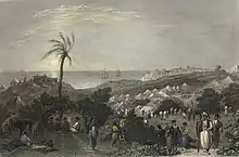 A new fleet and army was raised under Muhammad Ali, and on 31 October 1831, his son Ibrahim Pasha invaded Syria, initiating the First Egyptian–Ottoman War. The pretext for the expedition was Muhammad Ali's quarrel with Abdullah Pasha, the governor of Acre. Muhammad Ali alleged that 6,000 fellahin (peasants or farm laborers) had fled to Acre to escape the Egyptian draft, corvée, and taxes, and he demanded their return.[9] Ibrahim Pasha advanced through Palestine, occupied Haifa in December 1831, and made the city his primary military base.[8]