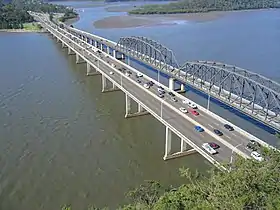 ![]() The Peats Ferry Bridge, pictured to the right, carries the Pacific Highway (B83). The Brooklyn Bridge on the left carries the Pacific Motorway (M1), as they both cross the Hawkesbury River | |