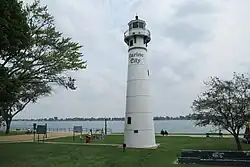 This light was built as part of a pair of range lights to guide ships to the south end of the lake.[2][4][5] Erected on a crib in open water, by 1908 it had developed a severe list to one side, and in 1983 it was replaced with a skeletal tower.[2] The old tower was saved, and minus its base, was installed in lighthouse Park in Marine City (42°42′59″N 82°29′30″W / 42.7164°N 82.4916°W), where it still stands.[2][4]