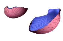 | Pected excavatus shell— left shell is shown in blue and is concave, right shell is shown in red and is highly convex | |