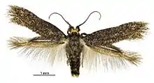The wingspan is 5.8-7.6 mm for males and 7.5-8.0 mm for females. The thorax and forewings are blackish fuscous and weakly shining. The hindwings are clothed in dark brown scales with iridescent reflections.[1]
