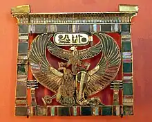 A later form was attached as a brooch, with the thematic, iconographic function and statement outweighing its actual use as a piece of jewellery for adornment. The thematic statements were typically about the pharaoh or statements of ancient Egyptian mythology and culture. They are usually of gold with cloisonné inlays of gemstones.