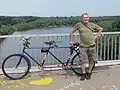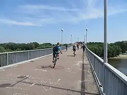 One of the powers of the Chernihiv bridges. It is the only pedestrian bridge across the Desna in the city of Chernigov. Administratively it is located within the city of Chernigov, connects the banks of the Desna, is located next to the Chernigov river port.[1] It has special barriers that prevent vehicles from passing through. It was built in 1987 by the NP Melnikov Central Research and Design Institute of Building Metal Structures.[2] In 2014, it was painted yellow and blue by activists. On the bridge you can use the services of bungee jumping, also known as a cult place for lovers, on special metal structures in the form of hanging padlocks.[3][4] On 23 March 2022, due to the Siege of Chernihiv by the 2022 Russian invasion of Ukraine the Road bridge Across the Desna was destroyed and since that, for 2 weeks, the only option to leave the city was a pedestrian bridge across the Desna. This way people left Chernihiv on foot to get to Anisov and Kulykivka through the fields. Cars with the most necessary things for the defenders of Chernihiv were allowed here separately. By the way the Pedestrian Bridge was a little bit damaged by operative,"In view of this, a joint decision was made with the Chernihiv Regional State Administration to limit traffic on this bridge as much as possible. Traffic is prohibited, only pedestrian crossing," the North North said in a statement.[5]