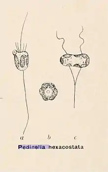 Pedinella is a genus of small, unicellular planktonic or attached, flagellated heterokonts first described in 1888 by A. V. Vysotskij.[1] The genus is monospecific, and the single species is Pedinella hexacostata Vysotskij.[1] Pedinella has an inverted bell or apple shape with a stalk arising from the posterior end, and has a single, long, ribbon-like, apical flagellum and, a second apical flagellum that is reduced to its basal body.[1][2] The cells are radially symmetrical, with a large central nucleus, surrounded equatorially by a number of chloroplasts that cause the body to bulge out where the plastids are pushed up against the plasma membrane.[1][2] The organism is found in freshwater and brackish freshwater habitats. Pedinella is a mixotroph and functions through either photosynthesis or by ingesting organic substances from its environment.