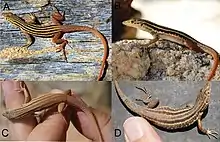 - 1 2 3 Childers, Jackie L.; Kirchhof, Sebastian; Bauer, Aaron M. (2021). "Lizards of a different stripe: phylogenetics of the Pedioplanis undata species complex (Squamata, Lacertidae), with the description of two new species". Zoosystematics and Evolution. 97 (1): 249–272. doi:10.3897/zse.97.61351.