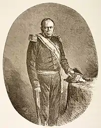 Shortly after Santana's resignation, Báez, his fierce enemy, returned to the country and was appointed vice president, with the clear intention that he immediately replace the provisional president Manuel de Regla Mota.[18] As soon as he assumed the presidency, Báez ordered the arrest of Santana, deporting him to Martinique on January 11, 1857. Shortly after, on July 7, 1857, a rebellion broke out in Santiago against the Báez government due to a government operation in the acquisition of tobacco that harmed merchants. The leaders of the movement had liberal conceptions and, although they had been friends of Santana, they expressed the intention of inaugurating a new style in the political future of the country, for which they installed a provisional government in Santiago chaired by José Desiderio Valverde. Although they received the support of almost all the populations, they calculated that it would not be easy for them to oust Báez from the presidency, since he had great support in Santo Domingo, a walled city. The Santiago government granted Santana permission to return to the country, soon appointing him in charge of operations against Báez. The siege of the city lasted 11 months, which is a sign of the strength that Baecism had achieved. Santana's new prominence is explained because the Cibaeños lacked military resources; In this way, after concluding the civil war, it became easy for him to depose the Valverde government at the end of July 1858.[19]