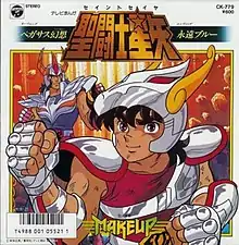 "Pegasus Fantasy" (ペガサス幻想, Pegasasu Fantajī) is a song by Japanese metal band Make-Up. Serving as the band's fourth major release single, "Pegasus Fantasy" and its B-side "Blue Forever" (永遠ブルー, Eien Burū) were used as the theme songs for the first half of the original Saint Seiya anime. "Pegasus Fantasy" became Make-Up's most successful release,[1] and they have re-released the song several times since its initial release in 1986. After releasing a "21st century ver." on their mini-album The Voice from Yesterday, Make-Up released a new edition of the song in 2012, subtitled "Version Omega", which features Shoko Nakagawa, the voice actress for Athena, on guest vocals and is used as the opening theme song for the re-imagined Saint Seiya Omega anime.[2] "Pegasus Fantasy Version Omega" reached number 29 on the Oricon's weekly rankings. Masami Kurumada, the author of the Saint Seiya manga, has even included "Pegasus Fantasy" in the manga, with a background character seen singing it. It was appereanced in Taiko no Tatsujin: Drum 'n' Fun!.