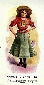 "Peggy Pryde would probably not have become famous in the variety "perfesh" if she had not been the daughter of that veteran and high priced music hall singer, Jennie Hill. Miss Pryde is pert, vivacious, sprightly and piquant. Her forte is serio-comic business, and she has made a great success of it. She is English, and while she was in New York Jennie Hill, "The Vital Spark," objected to her having her billed as her daughter, but Miss Pryde has now reached that point where she does not require anybody's reflected glory. She is earning money very fast, and is saving it too."[4]
