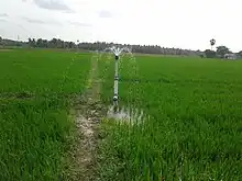 Thanjavur is known as the "Rice bowl of Tamil Nadu". Paddy is the crops and the other crops grown are Blackgram, Banana, Coconut, Gingelly, Ragi, Red gram, Green gram, Sugarcane and Maize. The total percentage of land fit for cultivation is 58%.[32] There are three seasons for agriculture in Thanjavur - Kuruvai (June to September), Samba (August to January) and Thaladi (September, October to February, March).[33] The total rice production has been maintained at 10.615 L.M.T and 7.077 L.M.T.[32] The town acts as a focal point for food grains transported from the adjoining areas of the Cauvery Delta. Organic farming is gradually being known to the farmers of Thanjavur. In order to maximize agricultural produce organic farming is being implemented.