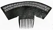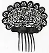 The peinetón is a one-piece headdress with a slightly convex body, with both sides fretworked and profusely decorated.[3] It is made up of two well-differentiated parts: the comb, which fulfills the functional role of securing the peinetón to the hair, and the field, the visible area that features the ornamentation.[3] Root noted that peinetones "could have from six to fourteen teeth and weigh 1.65 pounds (750 grams)".[1] They were typically made out of tortoiseshell, although the cheaper bull's horn was also used,[7] particularly when the former was in short supply.[3] Ivory, nacre and silver were also used to a lesser extent.[3] In the General Archive of the Nation there are numerous inventories of pulperías where peinetones made of talco (lit. 'talc') are also mentioned.[4] There are no known references as to the material they are referring to, although it may have been some kind of plaster.[4]