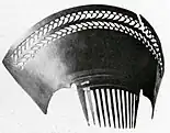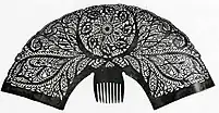 Peinetones were defined by their extravagant size, measuring up to 120 centimetres (3 feet 11 inches) in height and width at the height of their popularity.[5][6] They were typically made out of tortoiseshell, although the cheaper horn was also common,[7] particularly when the former was in short supply.[3] The tortoiseshell was imported as pieces or plates, which were cut, heat-fused, fretworked, chiseled and polished by craftsmen in the city's workshops, sometimes also being printed and inlaid.[8][1] The design of each peinetón was unique and tailored to the tastes of each woman.[2] The one-piece accessory had a slightly convex body, it came in a variety of different shapes and featured profuse ornamentation with designs inspired by nature and Neoclassicism.[3][4]