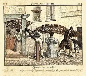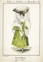 One of the fundamental visual representations of the fashion for peinetones was a series of lithographs produced by César Hipólito Bacle for his collection of prints Trages y costumbres de la provincia de Buenos Ayres [sic] (English: "Dress and customs of the province of Buenos Aires").[2] It was published in the form of an album and consisted of thirty-six lithographs classified in six booklets (cuadernos), each one dedicated to a peculiarity of Buenos Aires' urban life;[2] being framed within the genre of costumbrismo.[28] The peinetón was first depicted in the 1833 highly successful second edition of Trages y costumbres de la provincia de Buenos Ayres, whose second booklet is dedicated to representing the feminine clothing of porteño women.[3]