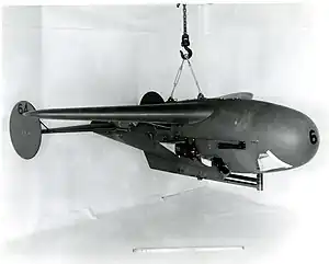 Two versions of Pelican were developed; one used a 1,000-pound (450 kg) bomb as its basis, named Pelican Mark II, while the other used a 1,500-pound (680 kg) bomb and was referred to as Pelican Mark III. Both had a high-mounted wing, with a twin-fin empennage providing stabilization and control. The semi-active radar seeker head was designed for use with the AN/APS-2 radar carried in the Lockheed PV-1 Ventura; the PV-1 could carry two Pelican Mark IIs or a single Pelican Mark III.[2] While Pelican required its launching aircraft to continue illuminating its target with its onboard radar following launch, compared to the Bat which carried its own radar set, Pelican could be released at a greater range.[3]