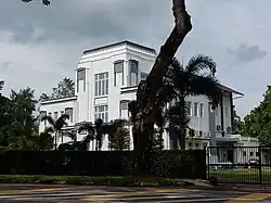 The Penang Masonic Temple is a historic Masonic building located at 136 Jalan Utama (Western Road), corner of Jalan Brown (Brown Road), in George Town, Penang, Malaysia. In 1924, The Royal Prince of Wales Lodge No. 1555, United Grand Lodge of England, and Lodge Scotia No. 1003, Grand Lodge of Scotland, each of which had its own meeting hall, agreed to build the Penang Masonic Temple at its current site to serve their own needs as well as those of other Masonic bodies in the area. A limited company was formed, with each lodge controlling half, to buy the property, construct the building and own and maintain it thereafter. The land was acquired in 1926 and the foundation was laid on 17 December 1927 Designed by architect Howard Leicester in the Art Deco style of architecture, the building was built by contractor Lee Ghee Sok. [1]