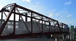 In January 2006,[2] the bridge was relocated to the Union Station in Kansas City to be a pedestrian crossing over the railroad tracks there.[3] The bridge was originally built as a three span thru-truss, but after relocation, it was rebuilt with two spans instead of three, and adapted into what was renamed the Freight House Pedestrian Bridge.[1]